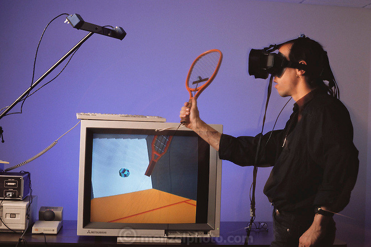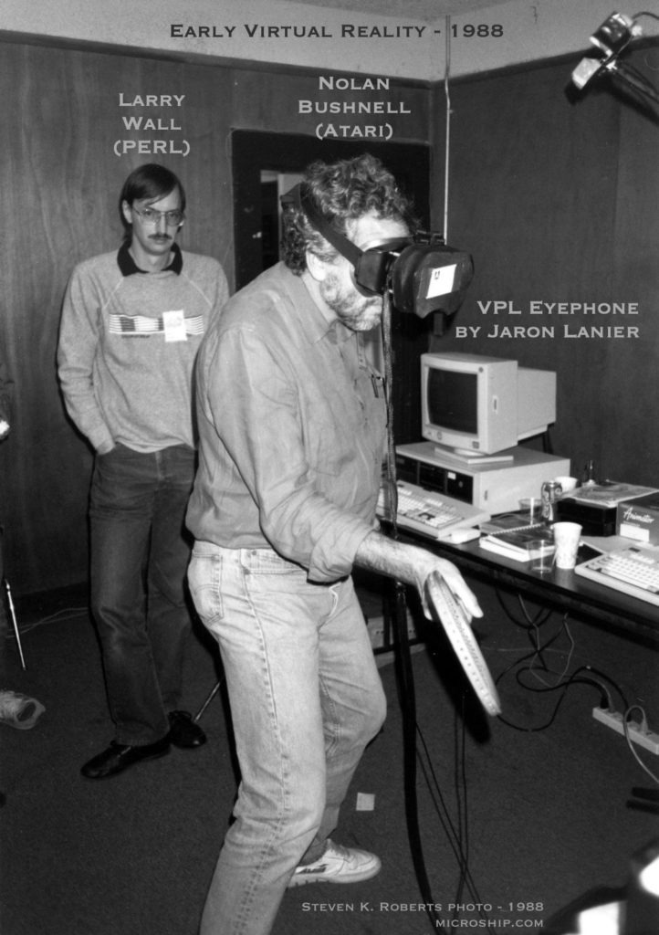 ↑ 诺兰·布什内尔(Nolan Bushnell)正在体验 VPL EyePhone(Steve Roverts 摄于1988)