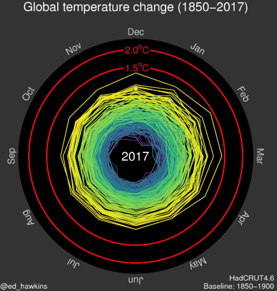 创建者:埃德·霍金斯(Ed Hawkins);核心数据集:HadCRUT4.6;
