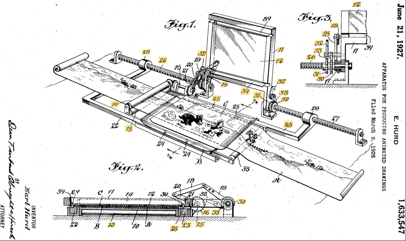 🛠️ 伊尔·赫德(Earl Hurd)获得了一种针对使用长卷背景画的赛璐璐动画拍摄台的专利,