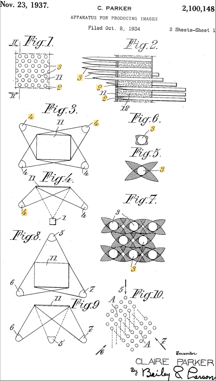 - 针屏装置由克莱尔·帕克在次年开始申请专利,专利名称为 Apparatus for producing images(US 2,100,148,授权日期 1937-11-23),对针阵结构与侧光成像原理作了系统说明。