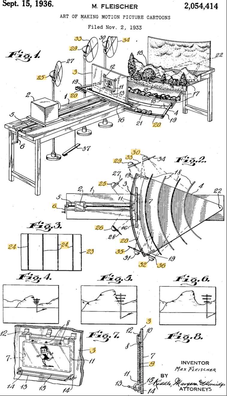 Fleischer M. ART OF’ MAKING MOTION PICTURE CARTOONS: US2054414A[P]. 1933-11-2日申请,1936-09-15获得.