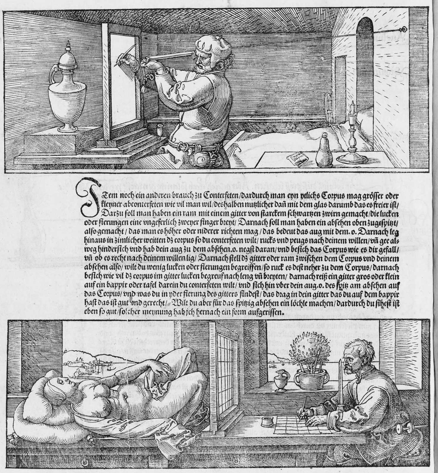 - 书末几幅著名木刻(例如“画家绘制琵琶”“画家绘制躺卧女性”)展示了他的透视装置:在画家与对象之间立起一块带网格的框架(或拉满细线的“网”),画家通过固定视点,用线或针标记物体在网格上的投影位置,再转绘到纸上。