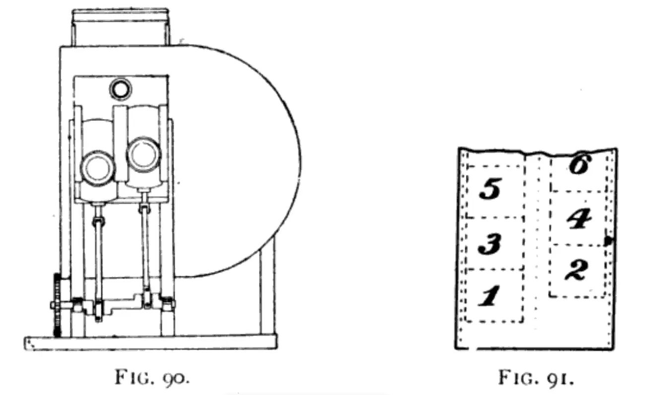 正如 霍普伍德(Hopwood) 在《Living Pictures》中所指出的,这套双镜头滑动结构在投影时会引入明显的视差——两只镜头从略有不同的角度“看”同一场景,相邻画格的视点并不完全一致,结果在银幕上就会出现物体轻微“振动”或“位移”的错觉,画面稳定性不佳。